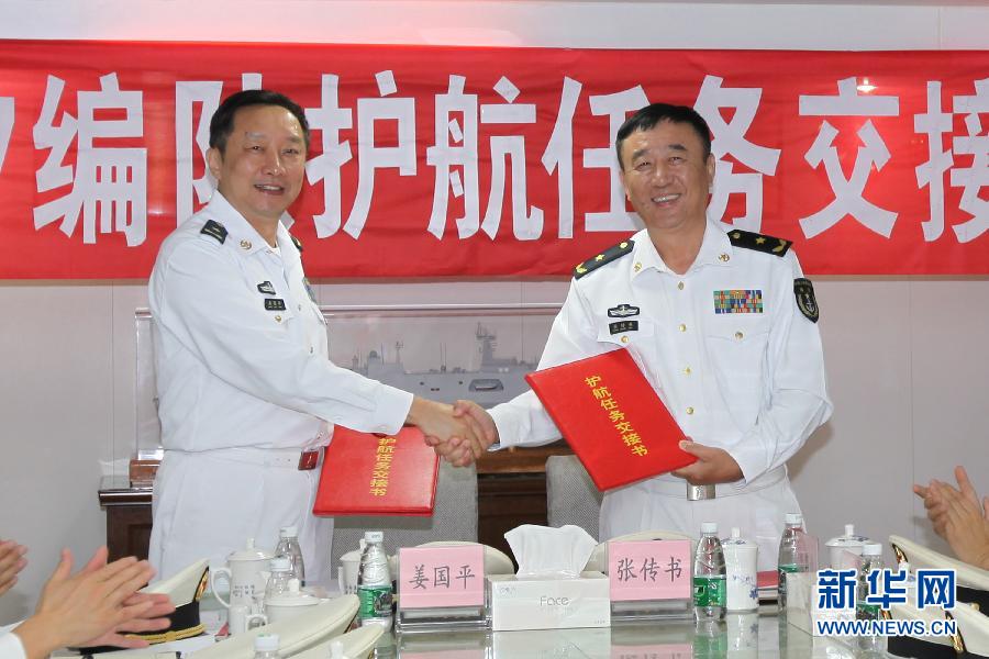 央廣網(wǎng)河南分網(wǎng)消息 據(jù)新華網(wǎng)報道:12月19日,在長白山艦會議室內(nèi),第十八批護航編隊指揮員張傳書(右)與第十九批護航編隊指揮員姜國平進行任務交接。當?shù)貢r間12月19日,中國海軍第十八批護航編隊長白山艦與第十九批護航編隊臨沂艦在亞丁灣中部海域會合,并舉行了任務交接儀式。新華社記者張月琳攝