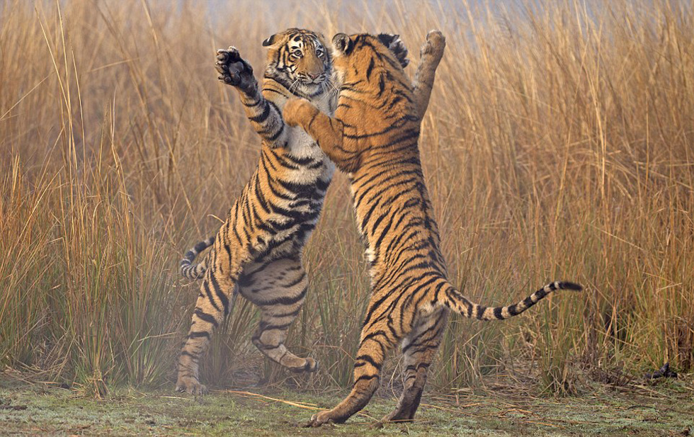 野生動物攝影師安迪·洛茲自從兩只小老虎去年出生以來,就一直在密切關(guān)注著它們的成長。他用鏡頭記錄下了這一畫面。雖然從舞蹈的嚴格意義上來評斷,這兩只小老虎的“舞”技一般,但它們在“舞蹈”中所散發(fā)出的熱情值得稱贊。而且,看上去它們的律動感不錯,配合地也相當有默契。(國際在線專稿 米粒)