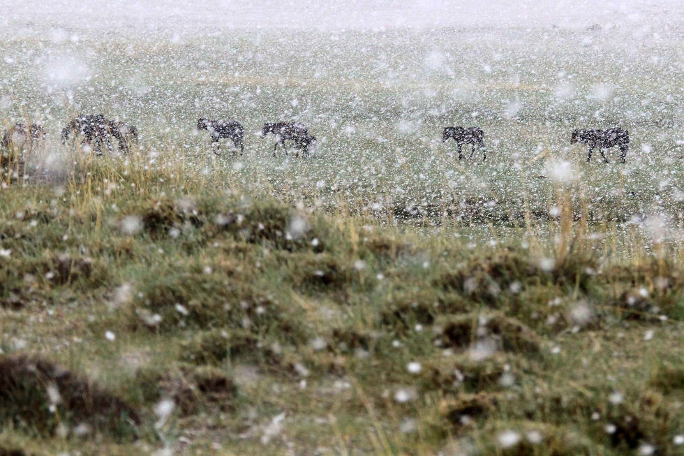 央廣網(wǎng)河南分網(wǎng)消息 2015年5月31日,受冷空氣影響,新疆哈密北部草原上出現(xiàn)了風(fēng)雪降溫天氣,夏日的草原大雪紛飛,給夏日的草原披上銀裝。