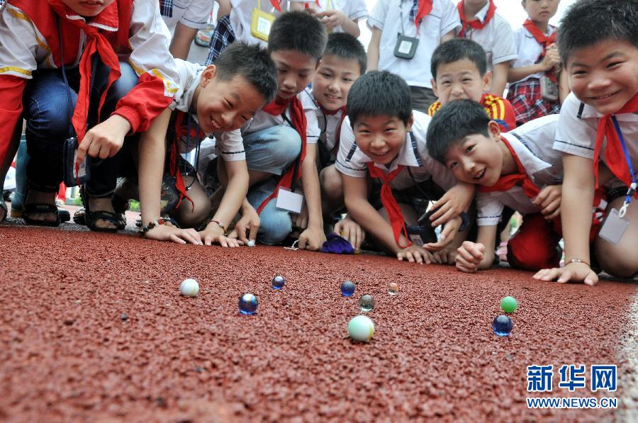 江西省萬載縣第一小學(xué)學(xué)生在玩“打彈珠”(5月27日攝)。