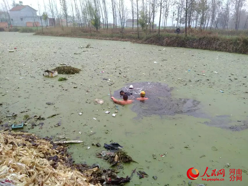 10月26日,虞城縣賈煙墩村在飄滿垃圾、惡臭熏天的污水坑中救人