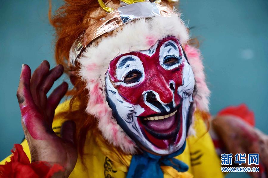 央廣網(wǎng)河南分網(wǎng)消息 81歲的“美猴王”何玉久是山東省桓臺縣人,16歲結緣“猴戲”,師從劉俊文、張恒貫等民間藝人。上世紀五六十年代,何玉久創(chuàng)新臉譜設計,把“倒栽桃形”與“橄欖形”結合起來,將眼窩從十字形改為濃眼圈加眉子,增添了“美猴王”的武生氣質。為了將“猴戲”和自己的本領傳承下去,2013年起,何玉久受聘于桓臺縣馬橋鎮(zhèn)陳莊小學,開設“猴戲”特長輔導班,免費為感興趣的孩子講授“猴戲”。新華社記者郭緒雷攝