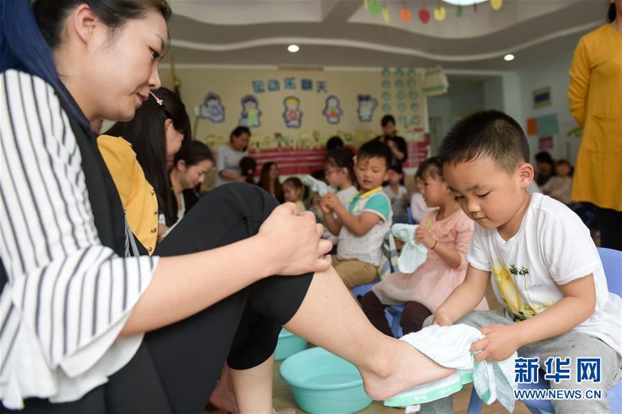 5月5日,在合肥市丁香家園幼兒園開展的“媽媽,我愛你”主題活動中,阮天佑小朋友(前右)給媽媽洗腳。