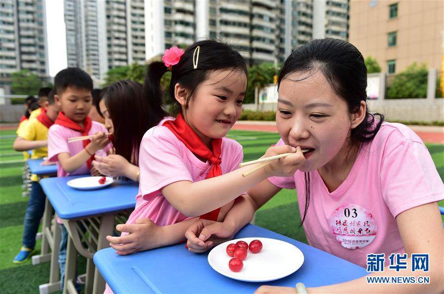 5月5日,在合肥市華府駿苑小學(xué),學(xué)生們在“感恩母親”親子趣味運動會上給母親喂水果。當(dāng)日,安徽省合肥市舉辦豐富多彩的活動,迎接即將到來的母親節(jié)。 新華社記者劉軍喜攝