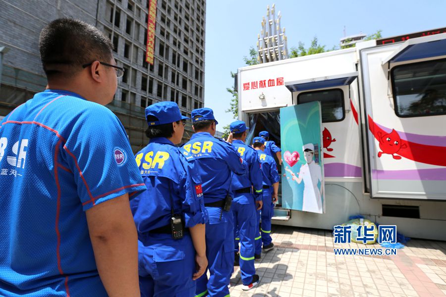 2016年6月14日,河南安陽老市政廣場愛心獻(xiàn)血屋,來自安陽、林州藍(lán)天救援隊(duì)的隊(duì)友排長隊(duì)參與無償獻(xiàn)血。