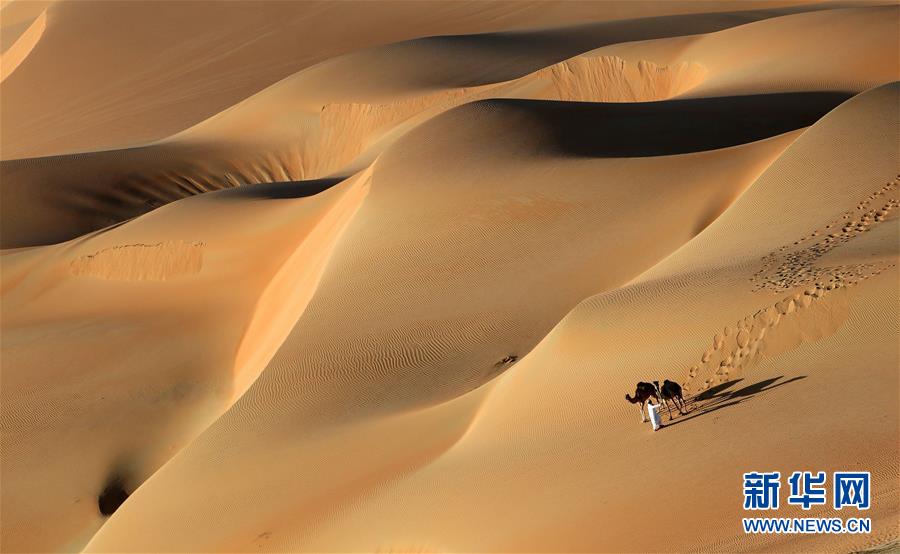 1月6日,在阿聯(lián)酋阿布扎比以西約250公里的利瓦沙漠,一名男子牽著駱駝走在沙丘上。