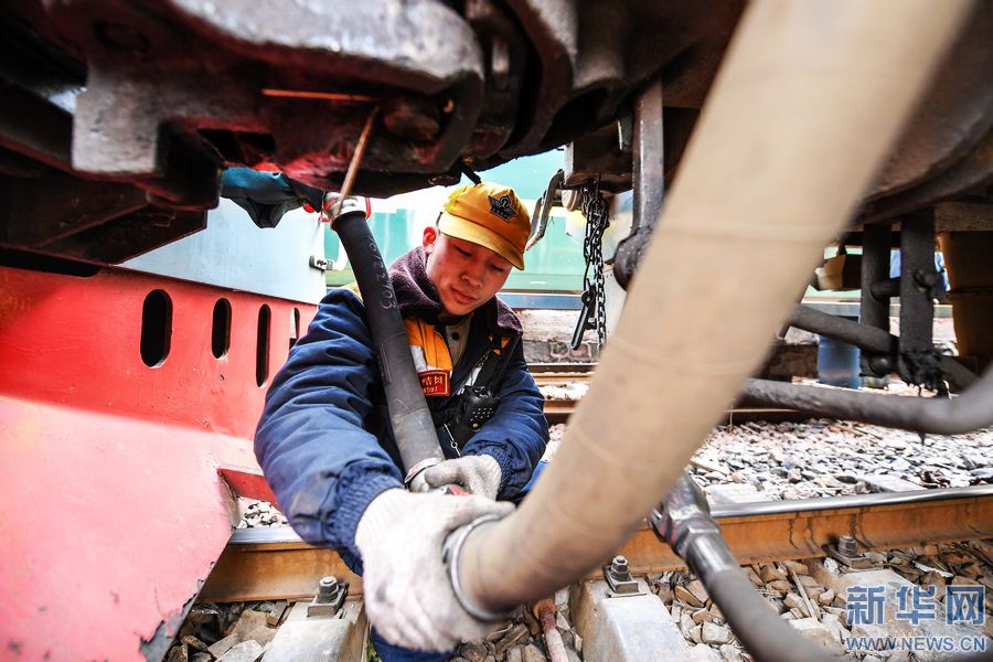 1月24日,一名連接員在連接車廂的底管。 春節(jié)臨近,鐵路迎來節(jié)前客流高峰。鐵路運(yùn)輸工作中,離不開一群為火車“穿針引線”的人——調(diào)車員,他們24小時(shí)不間斷輪班,保證列車按時(shí)出入庫,并根據(jù)車次、客流的變化,對(duì)列車車廂進(jìn)行拆分和重新編組,保障春運(yùn)期間列車安全、準(zhǔn)時(shí)運(yùn)送旅客。 鄭州火車站運(yùn)轉(zhuǎn)車間調(diào)車長(zhǎng)程浩說:“我們的工作是把一節(jié)節(jié)車廂編組成一列火車,將其中有問題的車廂換掉,送檢、清洗,再將整列火車?yán)交疖囌景l(fā)車,形象點(diǎn)說就是為火車穿針引線。”在鄭州火車站運(yùn)轉(zhuǎn)車間,調(diào)車小組一般由5人組成:一名調(diào)車長(zhǎng),四名組員。組長(zhǎng)負(fù)責(zé)指揮調(diào)車任務(wù),組員負(fù)責(zé)檢查和監(jiān)督列車車廂之間的分解與連掛,為車輛進(jìn)行排風(fēng)、摘管等。 春運(yùn)期間,鄭州火車站運(yùn)轉(zhuǎn)車間平均每天要對(duì)70余列近1300輛車進(jìn)行調(diào)車作業(yè),比平時(shí)增加30%左右的工作量。 新華社記者 李博 攝 -