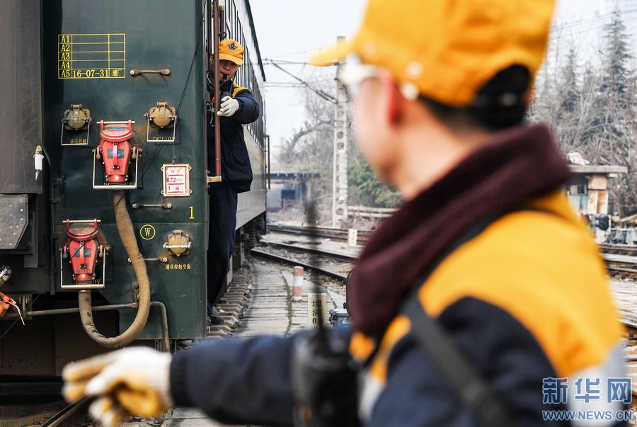 1月24日,調(diào)車員將有問題的車廂引導(dǎo)至檢修車庫。 春節(jié)臨近,鐵路迎來節(jié)前客流高峰。鐵路運(yùn)輸工作中,離不開一群為火車“穿針引線”的人——調(diào)車員,他們24小時(shí)不間斷輪班,保證列車按時(shí)出入庫,并根據(jù)車次、客流的變化,對(duì)列車車廂進(jìn)行拆分和重新編組,保障春運(yùn)期間列車安全、準(zhǔn)時(shí)運(yùn)送旅客。 鄭州火車站運(yùn)轉(zhuǎn)車間調(diào)車長(zhǎng)程浩說:“我們的工作是把一節(jié)節(jié)車廂編組成一列火車,將其中有問題的車廂換掉,送檢、清洗,再將整列火車?yán)交疖囌景l(fā)車,形象點(diǎn)說就是為火車穿針引線。”在鄭州火車站運(yùn)轉(zhuǎn)車間,調(diào)車小組一般由5人組成:一名調(diào)車長(zhǎng),四名組員。組長(zhǎng)負(fù)責(zé)指揮調(diào)車任務(wù),組員負(fù)責(zé)檢查和監(jiān)督列車車廂之間的分解與連掛,為車輛進(jìn)行排風(fēng)、摘管等。 春運(yùn)期間,鄭州火車站運(yùn)轉(zhuǎn)車間平均每天要對(duì)70余列近1300輛車進(jìn)行調(diào)車作業(yè),比平時(shí)增加30%左右的工作量。 新華社記者 李博 攝 -