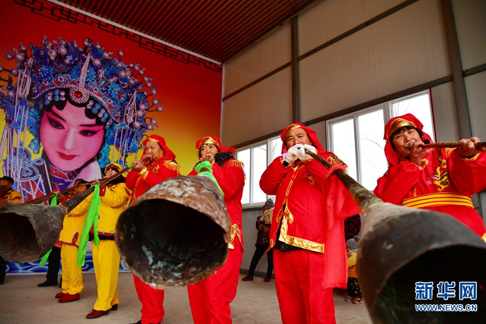2月7日,村民在羅閣村文化舞臺表演羅閣大喇叭。 當日,河南省駐馬店市西平縣盆堯鎮(zhèn)羅閣村的文化舞臺熱鬧非凡,村民表演了舞獅、豬八戒背媳婦、抬轎子、劃旱船、騎竹馬、吹喇叭等民俗節(jié)目,吸引眾多村民前來觀看。新華社記者馮大鵬攝 -