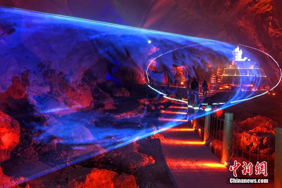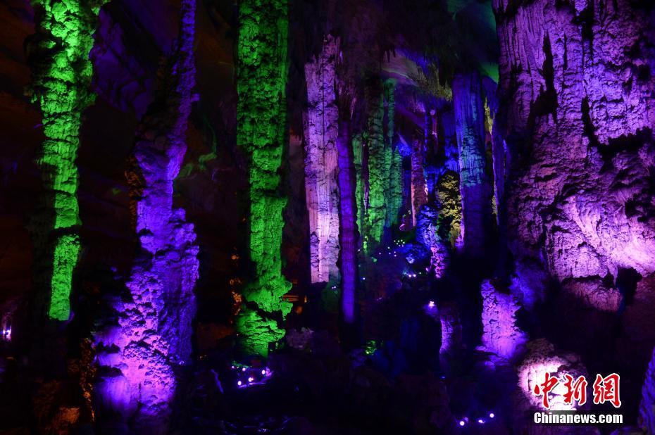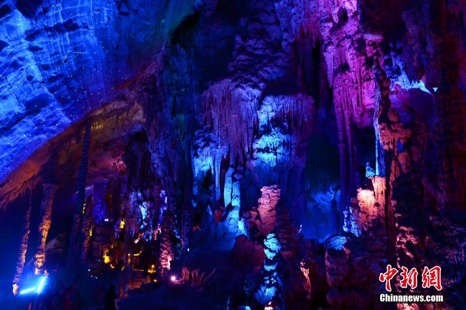 3月6日,來自全國(guó)的百余名游客慕名來到湖北五峰土家族自治縣長(zhǎng)生洞,觀看洞內(nèi)的“崖壁星空”景觀首秀。長(zhǎng)生洞位于北緯30°地理圈,其形成距今約1.4億年,洞口巧生東西峭壁間,縱深300米,橫跨1500米,上下三層,高約50至100米。洞內(nèi)分布著“穿越時(shí)空”“轉(zhuǎn)世蓮花”“崖壁星空”等20多處景點(diǎn),千姿百態(tài)的鐘乳石與七彩幻燈交相輝映,讓人在欣賞后嘆為觀止。五峰縣位于湖北省西南部,以喀斯特地貌為主,平均海拔1100米,是一個(gè)少數(shù)民族山區(qū)縣。圖為千姿百態(tài)的石鐘乳與七彩燈交相輝映。鐘欣 攝 -