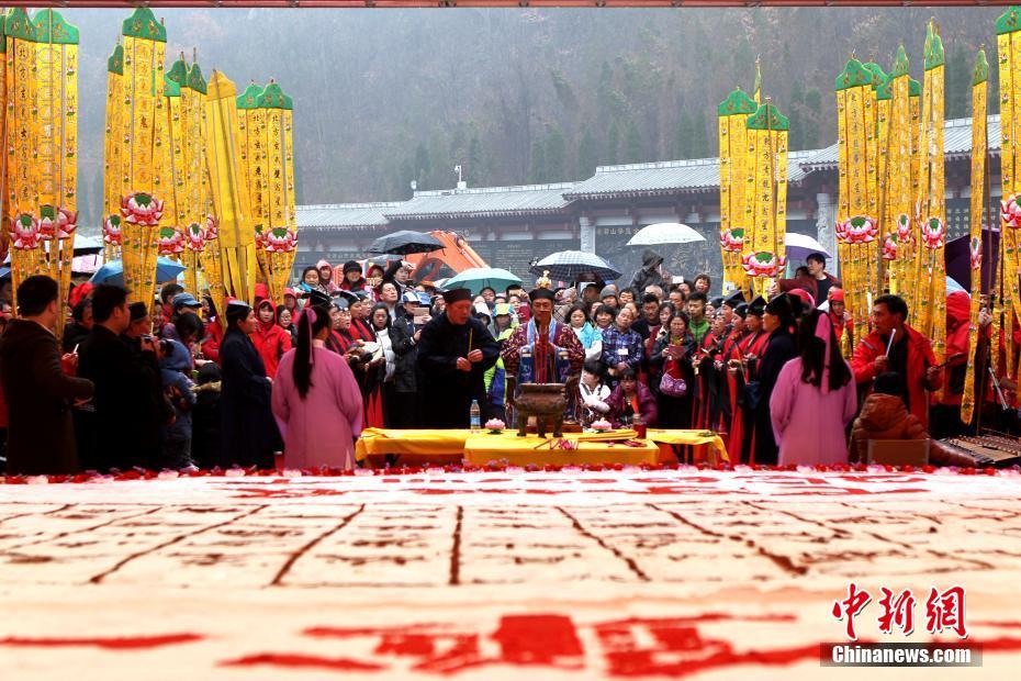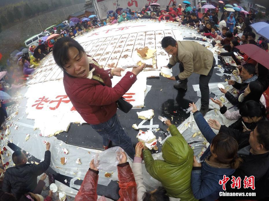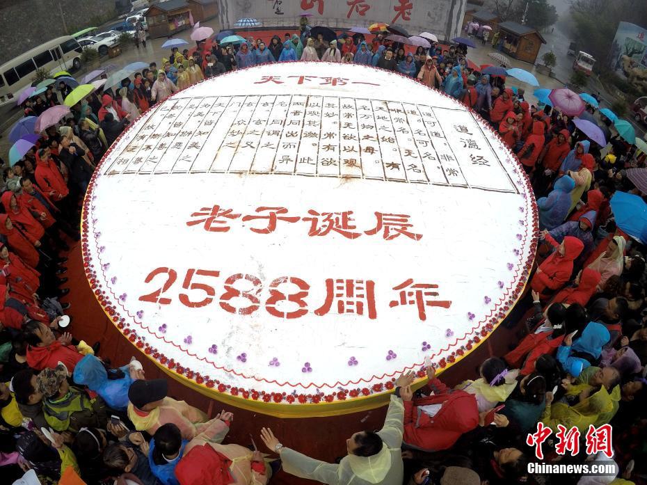 2017年3月12日(農(nóng)歷二月十五)是老子李耳誕辰2588年紀(jì)念,道教圣地河南洛陽老君山,世界第一高的老子銅像下,一個超級大蛋糕趕制完成,老子的千古巨著《道德經(jīng)》也被“寫”到了大蛋糕上,大批民眾圍觀,場面宏大。據(jù)了解,為趕制這個《道德經(jīng)》大蛋糕,主辦方用了雞蛋30000枚、白糖900斤、純牛奶600斤、奶油1200斤等物料,蛋糕總重達(dá)5噸。相傳河南欒川老君山是道教始祖李耳的歸隱地,每年都有大批的信眾前去紀(jì)念老子誕辰。經(jīng)老君山道長的加持祈福后,這個超級《道德經(jīng)》大蛋糕被近萬民眾陸續(xù)分食一空。 中新社記者 王中舉 攝 -
