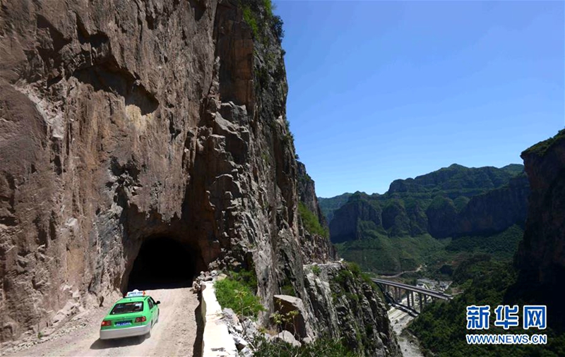 5月16日,一輛汽車在山西省平順縣的虹梯關(guān)“掛壁公路”行駛。山西省平順縣的虹梯關(guān)“掛壁公路”位于太行山峭壁之上,長(zhǎng)度約10公里,鑿山穿洞,道路艱險(xiǎn),風(fēng)光獨(dú)特。 新華社發(fā)(梁棟 攝)