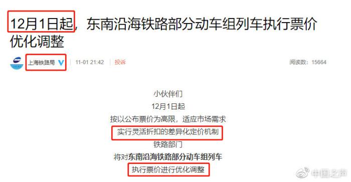 據(jù)中國(guó)之聲報(bào)道: “雙十一”將至,這兩天,一條“高鐵”也要參加“雙十一”的消息引發(fā)不少人的關(guān)注。近期,上海、成都、蘭州、廣州、南寧等鐵路局集團(tuán)公司陸續(xù)發(fā)布消息,將要對(duì)票價(jià)進(jìn)行調(diào)整。當(dāng)然,說(shuō)高鐵參加“雙十一”只是個(gè)玩笑話。首先,這調(diào)價(jià)可不是從11月11號(hào)開(kāi)始;其次,雖然最高折扣達(dá)到5.5折,但總體來(lái)看,票價(jià)有升有降,可不是一味“搞促銷”。