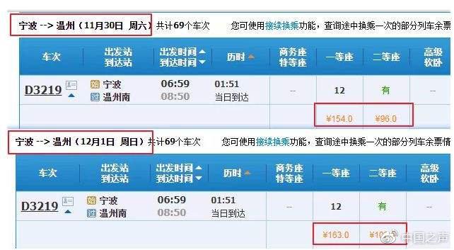 按照5.5折最低折扣,目前蘭州到西安的票價(jià)為174.5元,在最低價(jià)時(shí),或?qū)⒅恍?6元。然而,票價(jià)也并不是都處于降價(jià)趨勢(shì),對(duì)于部分列車段而言,票價(jià)也出現(xiàn)了上升的情況。以寧波開(kāi)往溫州的G2343次列車為例,11月30日,該車的商務(wù)座288元,一等座154元,二等座96元;而12月1日,該車的票價(jià)商務(wù)座、一等座、二等座分別上漲17元、9元和6元,票價(jià)出現(xiàn)了小幅上漲。