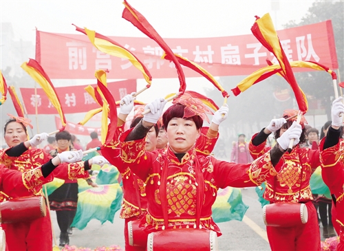 2月5日,河南省寶豐縣周莊鎮(zhèn)崔莊村秧歌隊(duì)隊(duì)員在表演。寶豐縣舉辦第二十三屆民間藝術(shù)大賽,來自全縣13個(gè)鄉(xiāng)鎮(zhèn)和企業(yè)的民間藝人敲起鑼鼓,扭起秧歌,歡歡喜喜鬧新春。王雙正攝
