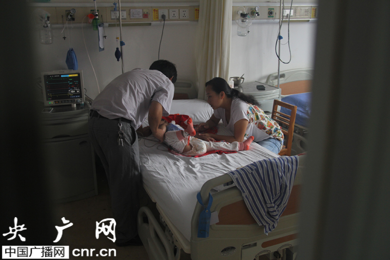 2014年8月29日晚9點半左右可以探望奇奇了,見到奇奇那一刻,奇奇的父親淚止不住的往下流,小奇奇用她那慣常的撅嘴巴方式來向父親表示歡迎,嘴里微弱的發(fā)出:媽媽,講個故事吧。聽著媽媽哭著講小兔子乖乖,奇奇手舞足蹈,所有的顧慮和擔(dān)心全化為淚水,盡情揮灑。