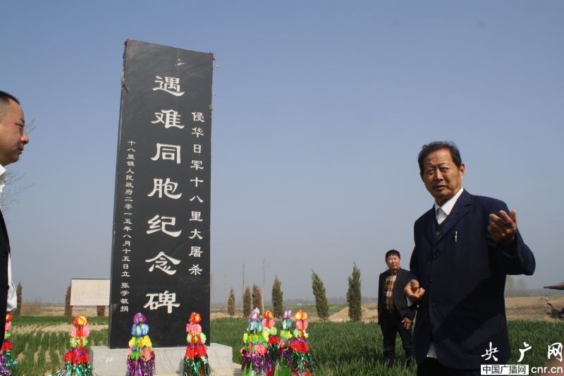 十八里鎮(zhèn)黨委副書記、鎮(zhèn)長張玉海對(duì)張先生的義舉表示肯定,他認(rèn)為,在近期日本刪減教科書中的南京大屠殺內(nèi)容、正式施行新修改的安保法的嚴(yán)峻背景下,在彰顯日軍又一大屠殺鐵證的“十八里村遇難同胞紀(jì)念碑”舉行祭奠儀式,意在深切緬懷70多年前遭到日寇屠殺的184位同胞,同時(shí)深情致敬在抗日戰(zhàn)爭(zhēng)中英勇犧牲的千千萬萬革命英烈。