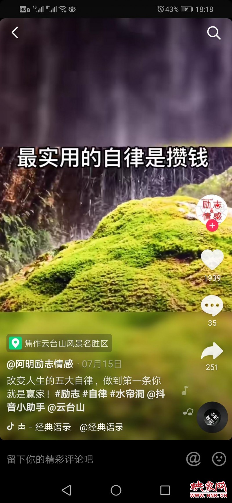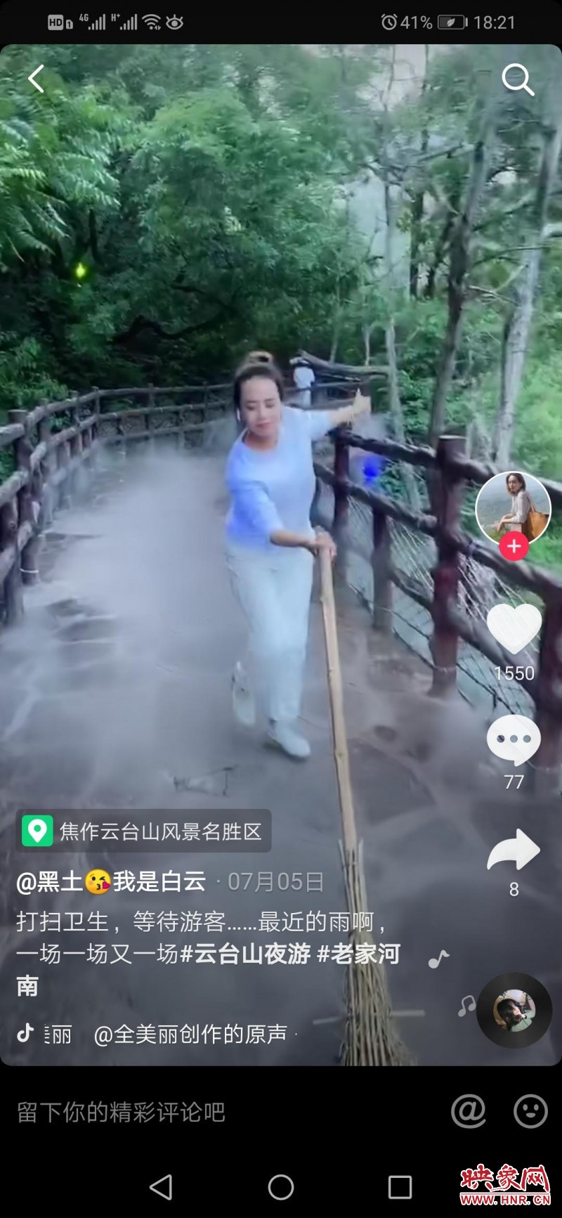 “有一次刷抖音,看到一個(gè)小姐姐在大山里配合音樂唱歌,感覺到是那么美,我就模仿這個(gè)視頻拍了一個(gè)抖音,當(dāng)時(shí)的燈光、天氣特別美,發(fā)出來以后一下就火了!惫自普f,“我工作的云臺(tái)山特別美,我就開始把歌曲和美景結(jié)合起來,推出一系列短視頻!