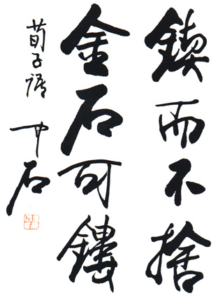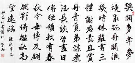 先后師從武巖法師和吳玉如先生,其書法各體兼通,而匯綜到行草書,以東晉書風(fēng)為宗,博采周金汗石、碑刻法帖之長,形成飄逸而沉穩(wěn)、剛健而溫潤、靈動而厚重的藝術(shù)風(fēng)格。代表性作品出版有《中石夜讀同鈔》、《中石鈔讀清照詞》、《老子道德經(jīng)書卷》(小楷)、《朱子治家格言》(楷書)、《歐陽中石書古文辭》、《道德經(jīng)》(章草)等。歐陽中石具有深厚的國學(xué)功底,在邏輯、音韻、戲劇、書學(xué)、語文教育學(xué)專門領(lǐng)域有很高的造詣,其主要著作《中國邏輯史》、《中國邏輯思想史教程》、《書法與中國文化》、《中國書法史鑒》、《書法教程》、《書法教學(xué)參考資料》、《中國的書法》、《章草便檢》、《學(xué)書津梁叢書》(六冊)、《章草字典》等,在有關(guān)學(xué)科領(lǐng)域都有很重要的影響。