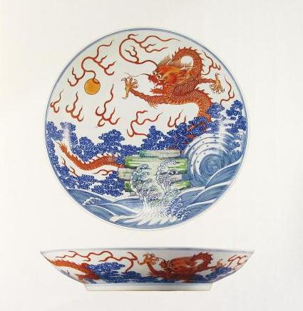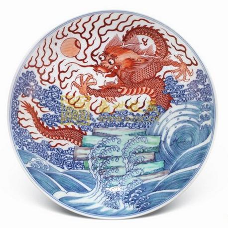 上海斗寶藝術(shù)展出青花斗彩海水龍紋盤(pán)