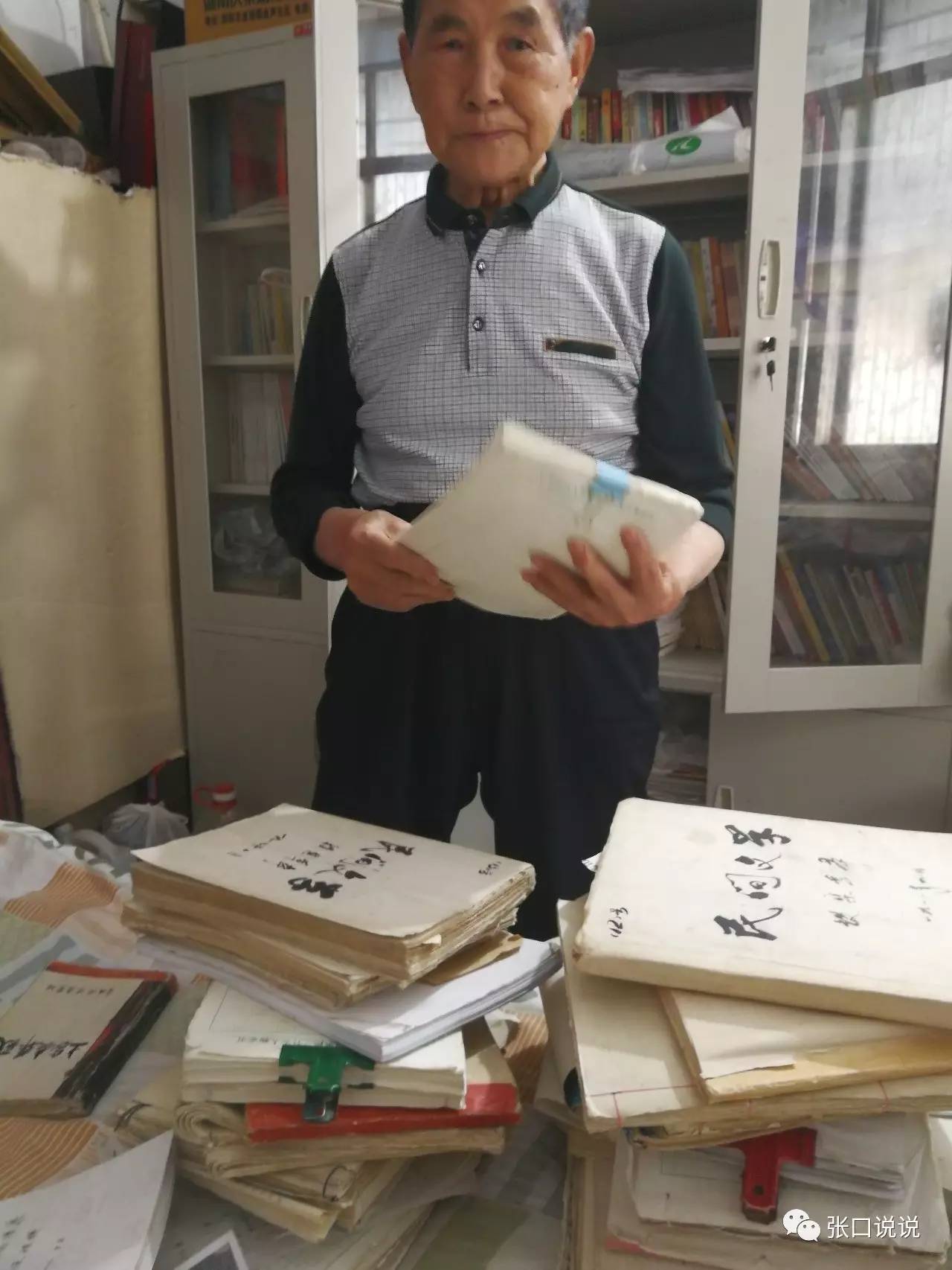 圖:寧遠(yuǎn)俊老人和他搜集整理的民間文學(xué)作品手稿