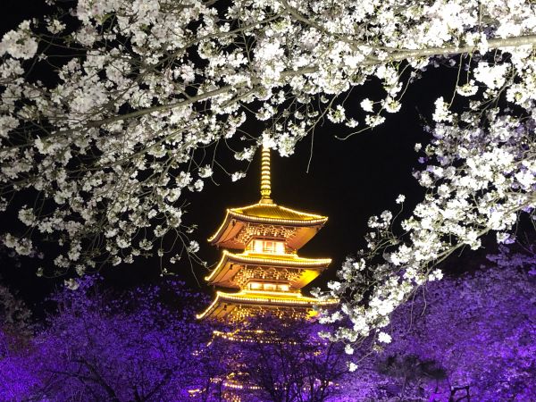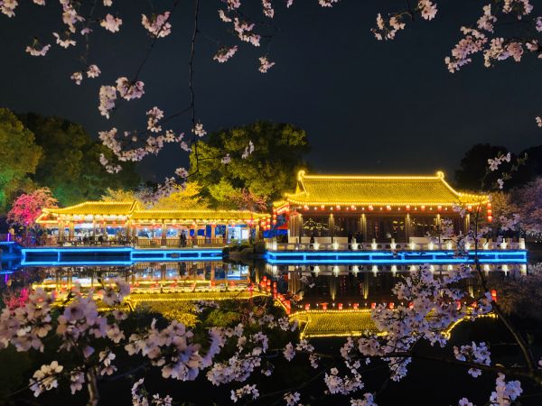 “白天賞櫻花本身,夜間賞櫻花園意境。”傍晚時(shí)分,暮色將櫻園籠罩,園內(nèi)彩燈盡數(shù)亮起,423畝東湖櫻花園被瞬間點(diǎn)亮。白天內(nèi)斂典雅的曲院櫻艷張揚(yáng)了起來,飛檐上掛著紅彤彤的燈籠,與極具古風(fēng)的仙鶴畫舫交相輝映;五重塔靜靜矗立,描金勾勒出東湖櫻花園最亮眼的部分;花溪流水潺潺,倒映出五彩斑斕的燈影,如夢(mèng)如幻。