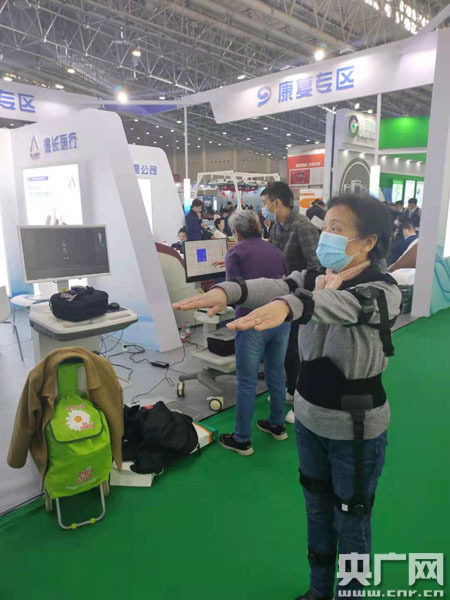在位于醫(yī)療器械展館的智能化康復訓練器械體驗區(qū),家住武漢硚口區(qū)的王阿姨正在體驗三維步態(tài)評估儀,只見她身穿感應裝置做出各種動作,位于左側的顯示屏上一個數(shù)據(jù)小人正隨她的動作改變形態(tài)!斑@是我們公司最新研發(fā)的三維步態(tài)評估儀,使用者只需簡單穿戴數(shù)據(jù)傳輸裝置并做出動作,智能計算機便可根據(jù)其動作幅度判斷受評者關節(jié)部位是否發(fā)生病變。”該三維步態(tài)評估儀生產(chǎn)商說。