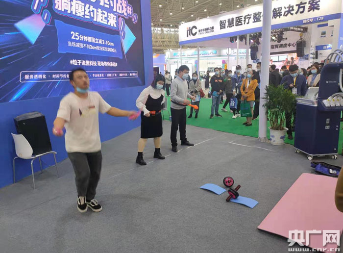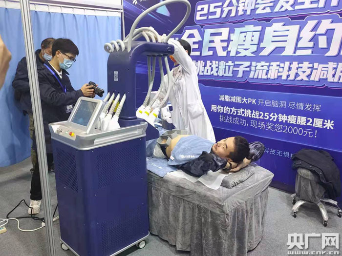 “加油跳,跳滿25分鐘,只要沒有像他們說的減脂成功,我們就能得到獎勵”在該展館的醫(yī)普茂展區(qū),一名參與“全民瘦身約戰(zhàn)”的女孩對同伴喊道。活動現(xiàn)場,不少參觀者踴躍參加25分鐘減圍挑戰(zhàn),但在經(jīng)過約十分鐘的跳繩與搖健身環(huán)后均“敗下陣來”。隨后,該參展商向大家介紹了核心“黑科技”——粒子流轟脂科技,并邀請參展人群進行體驗。
