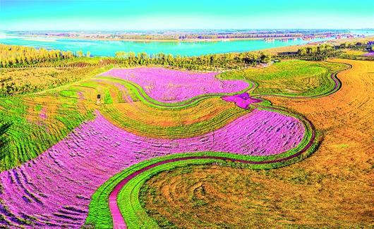 11月10日,花海簇?fù)硐碌乃{(lán)星島生態(tài)景觀。位于江陵縣馬家寨鄉(xiāng)的藍(lán)星島是由長江泥沙淤積而成的江心洲,總面積5000畝。藍(lán)星島將生態(tài)優(yōu)先擺在壓倒性位置,已建成蘆葦公園、七彩花田、花果園、生態(tài)牧場等景觀帶,為生態(tài)長江再添美景。