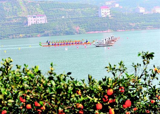 12月12日,在秭歸縣水田壩鄉(xiāng)吒溪河,參賽龍舟隊伍奮力爭先。當日,第十屆湖北省龍舟大賽吒溪河舉行,來自全省的12支龍舟隊伍展現(xiàn)龍舟激情,喜慶臍橙豐收。