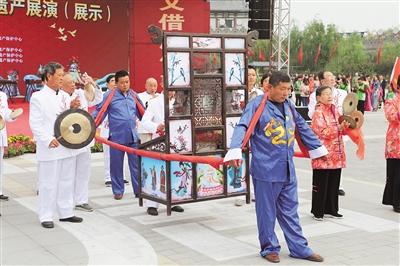 11月2日至3日,襄陽市非物質文化遺產展演(展示)活動,在該市唐城景區(qū)舉行,老河口木版年畫、棗陽粗布、襄河道墜子等70多個“非遺”項目集體亮相,吸引觀眾駐足。圖為現(xiàn)場表演國家級非遺項目老河口鑼鼓架子。(視界網 曹鏑 攝)