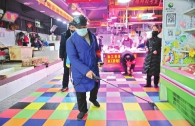 22日,長(zhǎng)江日?qǐng)?bào)記者隨同身穿防護(hù)服的消毒人員,先后進(jìn)入武漢開(kāi)發(fā)區(qū)(漢南區(qū))沌陽(yáng)農(nóng)貿(mào)市場(chǎng)和新民農(nóng)貿(mào)市場(chǎng)展開(kāi)專業(yè)消殺!坝捎谵r(nóng)貿(mào)市場(chǎng)占地面積比較大,我們會(huì)分片區(qū)消毒。每天晚上閉市后,我們會(huì)對(duì)商戶島內(nèi)消毒,并要求商戶做好盤存整理工作!蔽錆h開(kāi)發(fā)區(qū)(漢南區(qū))愛(ài)衛(wèi)辦負(fù)責(zé)人說(shuō),“22天來(lái),我們對(duì)轄區(qū)內(nèi)所有農(nóng)貿(mào)市場(chǎng)采取24小時(shí)滾動(dòng)消毒,定點(diǎn)消殺作業(yè)無(wú)死角,絕不放過(guò)任何一個(gè)垃圾桶、窨井口!