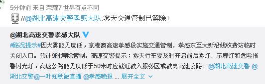 @湖北高速交警孝感大隊:京港澳高速孝感段,霧天交通管制已解除!