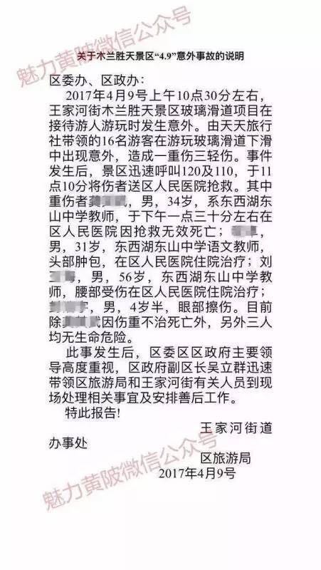 今天,一則木蘭勝天景區(qū)玻璃滑道上發(fā)生游客傷亡事故的消息,在網(wǎng)上迅速流傳。消息稱,9日上午10時(shí)30分許,武漢天天旅行社導(dǎo)游帶領(lǐng)的旅游團(tuán),在玻璃滑道上出事。其中一人死亡,3人受傷,均為武漢東西湖區(qū)東山中學(xué)老師和家屬。沒有搶救過(guò)來(lái),去世的龔老師34歲。