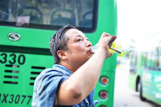 楚天金報(bào)訊 圖為:公交維修人員大口喝水 記者張吉晴攝