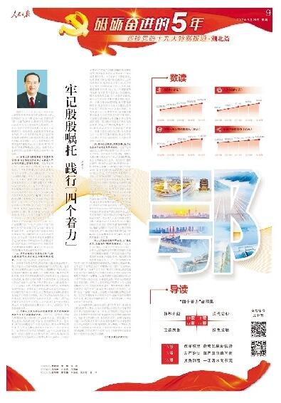 湖北日報訊(記者江卉)《人民日報》昨日推出“砥礪奮進的5年·迎接黨的十九大特別報道·湖北篇”,用8個彩色整版的篇幅,全方位、立體化地報道了湖北深入貫徹落實習(xí)近平總書記系列重要講話特別是視察湖北時的重要講話精神,全面深入總結(jié)了黨的十八大以來湖北經(jīng)濟社會發(fā)展和黨的建設(shè)取得的豐碩成果以及巨大變化!昂逼蓖瑫r刊發(fā)了省委書記蔣超良的署名文章《牢記殷殷囑托 踐行“四個著力”》,以及人民日報記者對省委副書記、省長王曉東的專訪《改革“釘釘子”敢為天下先》。