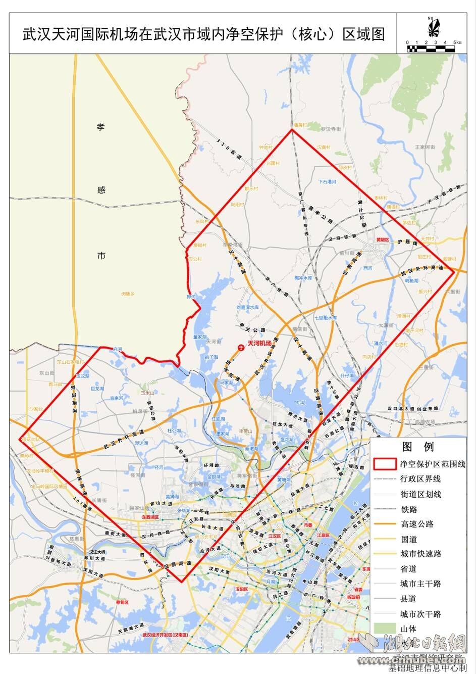 據(jù)規(guī)定,武漢天河國際機(jī)場(chǎng)跑道中心線兩側(cè)各10公里、跑道兩端各20公里以內(nèi)的區(qū)域?yàn)闄C(jī)場(chǎng)凈空保護(hù)(核心)區(qū)域,總面積800平方公里。該區(qū)域包含黃陂區(qū)、東西湖區(qū)、硚口區(qū)、漢陽區(qū)的部分區(qū)域,另有涉及孝感市的部分區(qū)域?qū)⒂珊泵窈奖O(jiān)管局協(xié)調(diào)孝感市進(jìn)行管理。