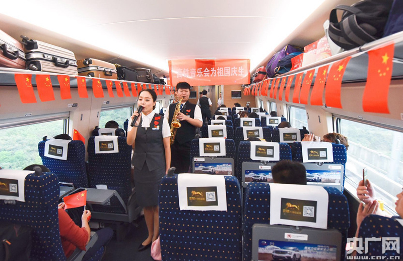 當日10點06分,在武漢開往北京西的G514次列車上,鮮艷的五星紅旗將車廂裝點得喜氣洋洋,“高鐵音樂會”在4 號車廂舉行。
