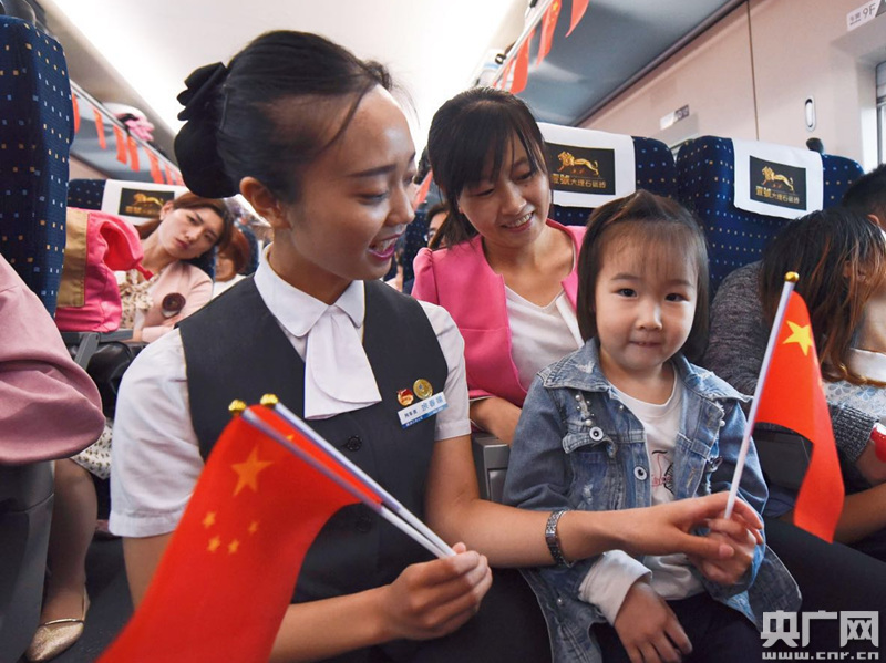 車廂里的小朋友也異常的興奮,揮舞著五星紅旗,穿梭在車廂內,并自發(fā)組成合唱團演唱《我愛北京天安門》,引來周圍陣陣掌聲。