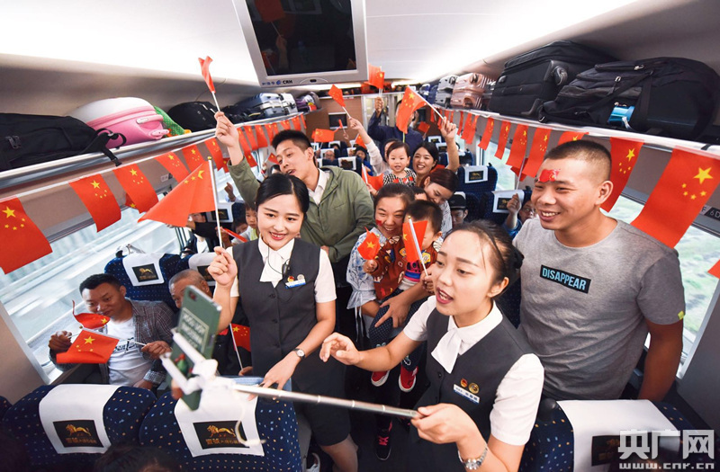乘務員和旅客們演唱的《我愛你中國》、《紅旗飄飄》、《國家》、《精忠報國》等一首首經典歌曲,引得車廂全體旅客應聲合唱,心中熱血沸騰,在互動環(huán)節(jié),旅客們紛紛感嘆近年來祖國的變化,祝福祖國繁榮富強。