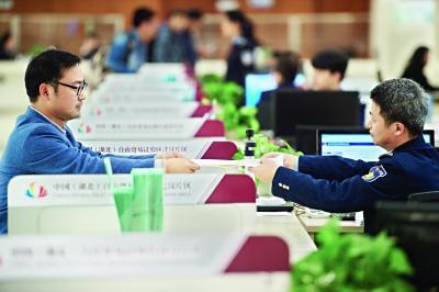 中國(湖北)自由貿(mào)易試驗區(qū)武漢片區(qū),企業(yè)在大廳辦理業(yè)務(wù)。記者任勇攝