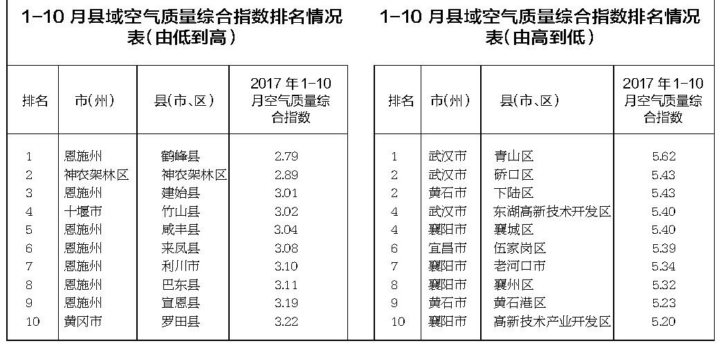 湖北日?qǐng)?bào)訊2017年1-10月,全省納入114個(gè)縣域空氣自動(dòng)監(jiān)測(cè)站聯(lián)網(wǎng)的縣(市、區(qū))中,按照環(huán)境空氣質(zhì)量綜合指數(shù)排名,環(huán)境空氣質(zhì)量相對(duì)較好的10個(gè)地方依次為:恩施州鶴峰縣、神農(nóng)架林區(qū)、恩施州建始縣、十堰市竹山縣、恩施州咸豐縣、恩施州來鳳縣、恩施州利川市、恩施州巴東縣、恩施州宣恩縣、黃岡市羅田縣;環(huán)境空氣質(zhì)量相對(duì)較差的10個(gè)地方依次為:武漢市青山區(qū)、武漢市硚口區(qū)、黃石市下陸區(qū)(并列第二)、武漢市東湖高新技術(shù)開發(fā)區(qū)、襄陽(yáng)市襄城區(qū)(并列第四)、宜昌市伍家崗區(qū)、襄陽(yáng)市老河口市、襄陽(yáng)市襄州區(qū)、黃石市黃石港區(qū)、襄陽(yáng)市高新技術(shù)產(chǎn)業(yè)開發(fā)區(qū)。