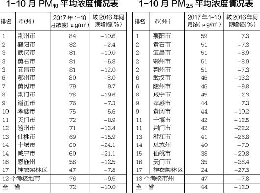 湖北省2017年1-10月空氣顆粒物平均濃度通報(bào)