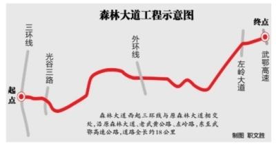 森林大道規(guī)劃為城市主干道,西起三環(huán)線與原森林大道相交處,沿原森林大道、老武黃公路、左嶺路,東至武鄂高速公路,道路全長約18公里,道路開通后將成為武漢與鄂州之間的又一條重要聯(lián)系通道,也將是一條交通干道和景觀大道。