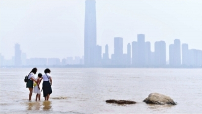 昨日,幾位游客站在水中吹江風(fēng)記者李永剛 攝