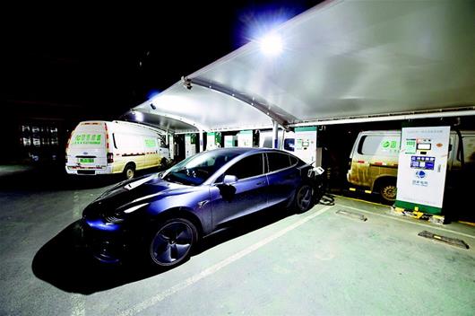 圖為:8月28日晚,一輛特斯拉電動(dòng)車在武漢徐東大街的一家充電站充電。該車充滿約60度電,電費(fèi)不足70元,可行駛近500公里。