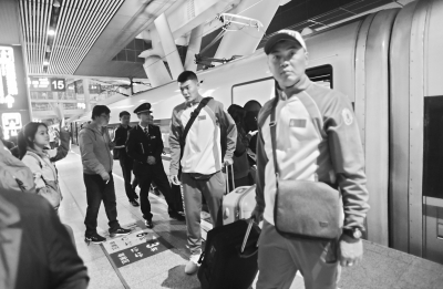 19點(diǎn)43分,列車緩緩進(jìn)站停穩(wěn),只見蒙古代表團(tuán)成員統(tǒng)一身著白藍(lán)紅三色的隊(duì)服下車。運(yùn)動(dòng)員們拿著行李從D3出口出站,跟隨工作人員的指引來到一樓西出站口,5輛大巴車和4輛行李車在門口等候。談到乘坐高鐵的感受,蒙古運(yùn)動(dòng)員紛紛稱贊中國高鐵的方便快捷、武漢的交通便利。