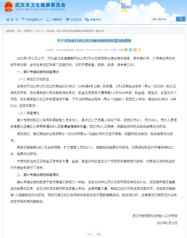 該病例于2021年1月3日23時乘坐Z335車次(14車廂4號上鋪)到武昌,1月4日乘坐出租車(鄂A-X3U09)到漢正街批發(fā)市場,在長堤街路口民生甜食館吃早點(diǎn),到金正茂商務(wù)大廈停留1小時30分鐘后,到金座、藍(lán)寶石、紅寶石三個市場,在長堤街路口王記牛肉面館吃午餐,下午14時乘坐出租車(鄂A-XQ861)到武漢火車站,乘坐G422車次(4車01A)返回石家莊。