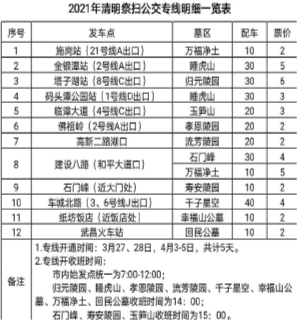 祭掃專線開通時(shí)間為3月27日、28日,4月3日至5日,共5天。共有13條專線,在市內(nèi)設(shè)有12個(gè)乘車點(diǎn),分別開往歸元陵園、睡虎山、孝恩陵園、流芳陵園、千子星空、幸福山公墓、萬(wàn)福凈土、石門峰、壽安陵園、玉筍山、回民公墓等墓區(qū)。