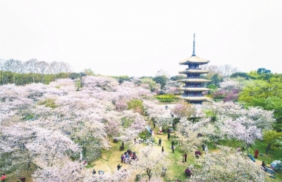 3月23日,武漢東湖櫻園,一萬余株櫻花盛放,游人如織。